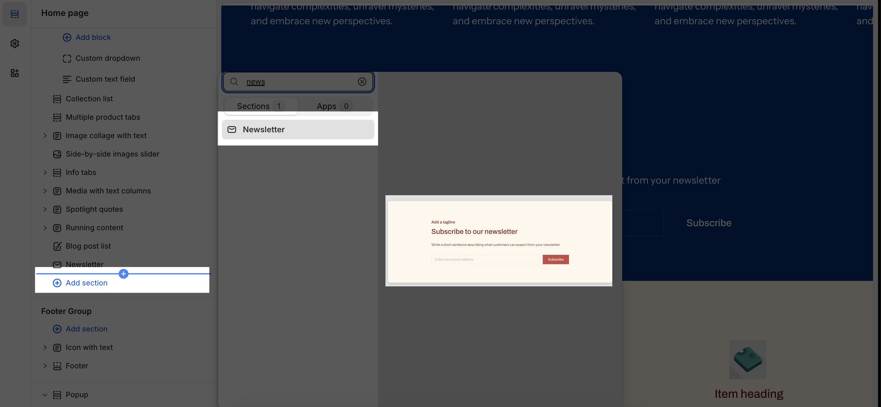From any page, please click on ‘Add Section’ on the left side bar, then choose ‘Newsletter’.