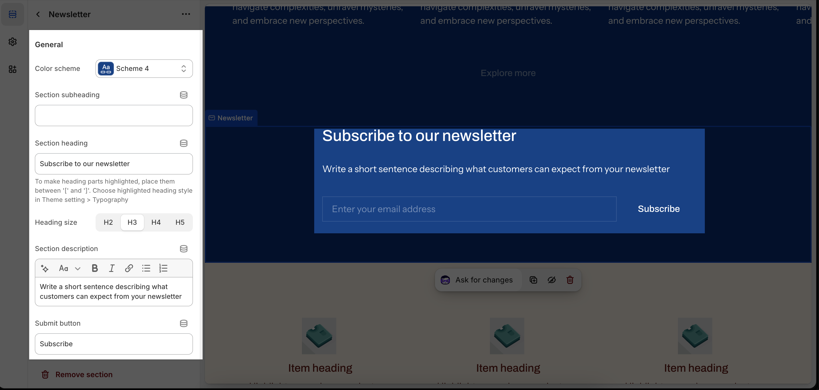 The Shine Newsletter section is designed to collect email addresses from your visitors, providing a potent tool for cultivating customer relationships and boosting sales.