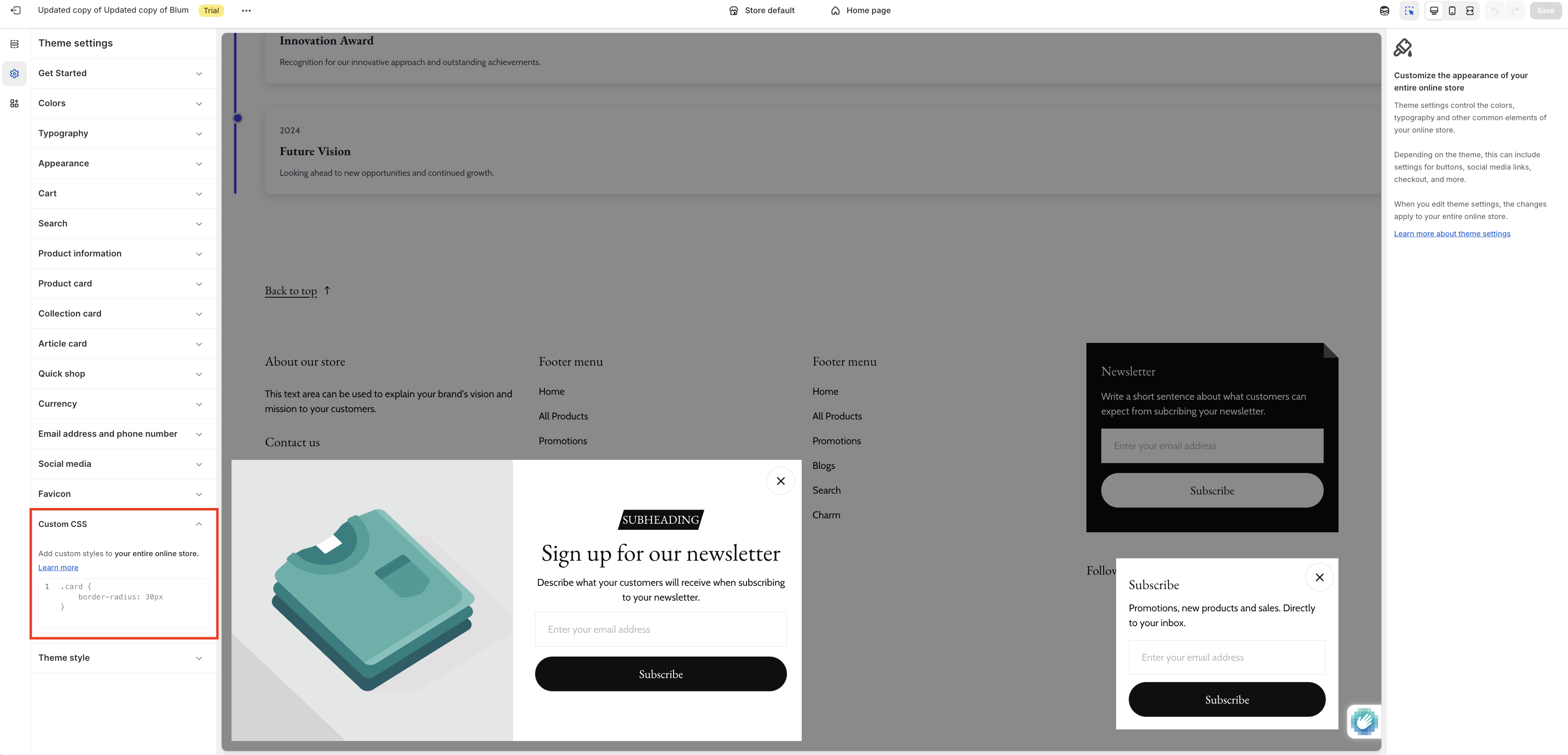 The Custom CSS feature in Blum Theme allows you to add your own custom CSS code to personalize and enhance your store’s appearance beyond the default theme settings. This powerful tool is perfect for making specific style adjustments without modifying the theme’s core files.
