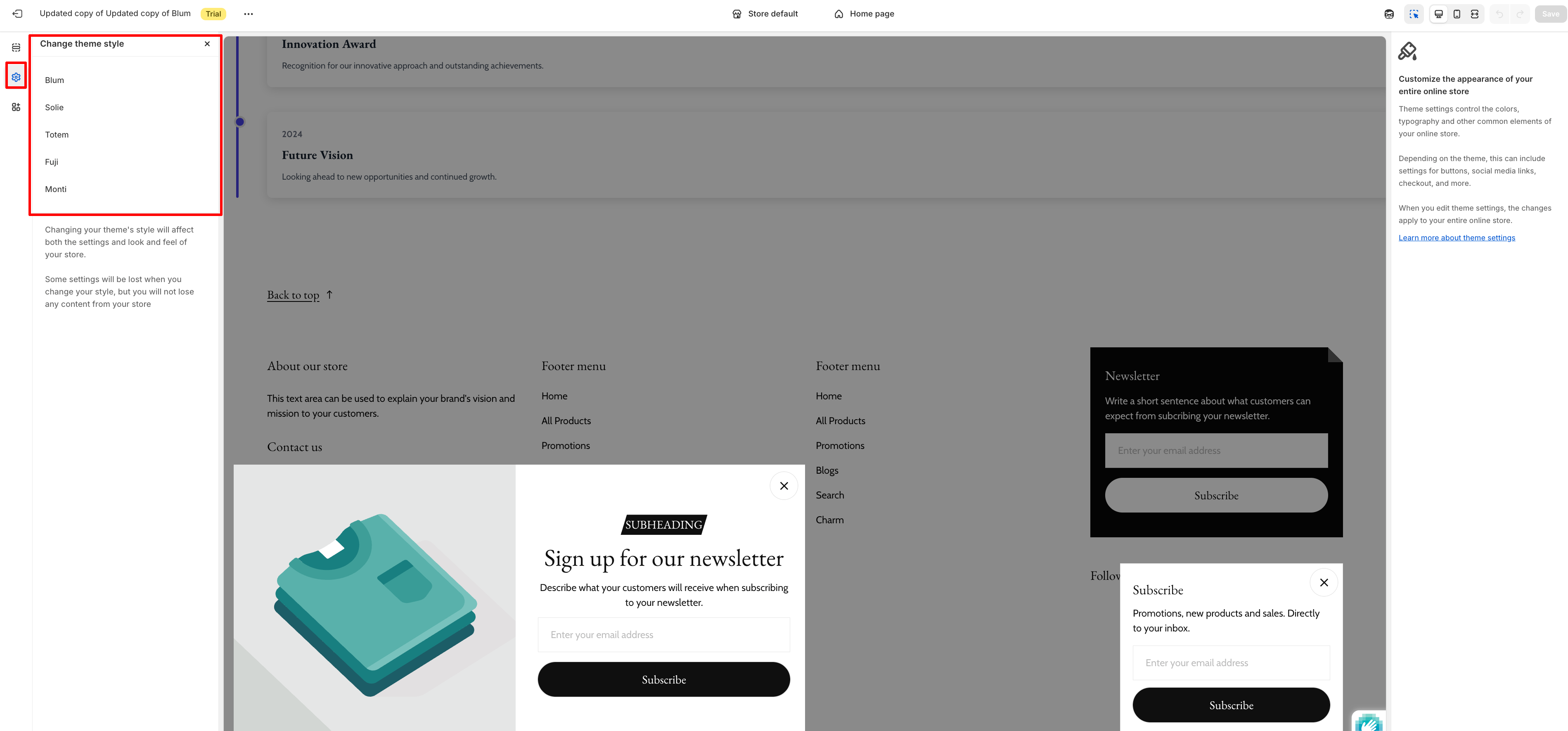 When you select a new theme style, it will automatically update multiple theme settings at once to match the chosen aesthetic. This is particularly useful if you want to refresh your store’s appearance or experiment with different design directions. You can always switch back to a previous style or make additional customizations after applying a new theme style.