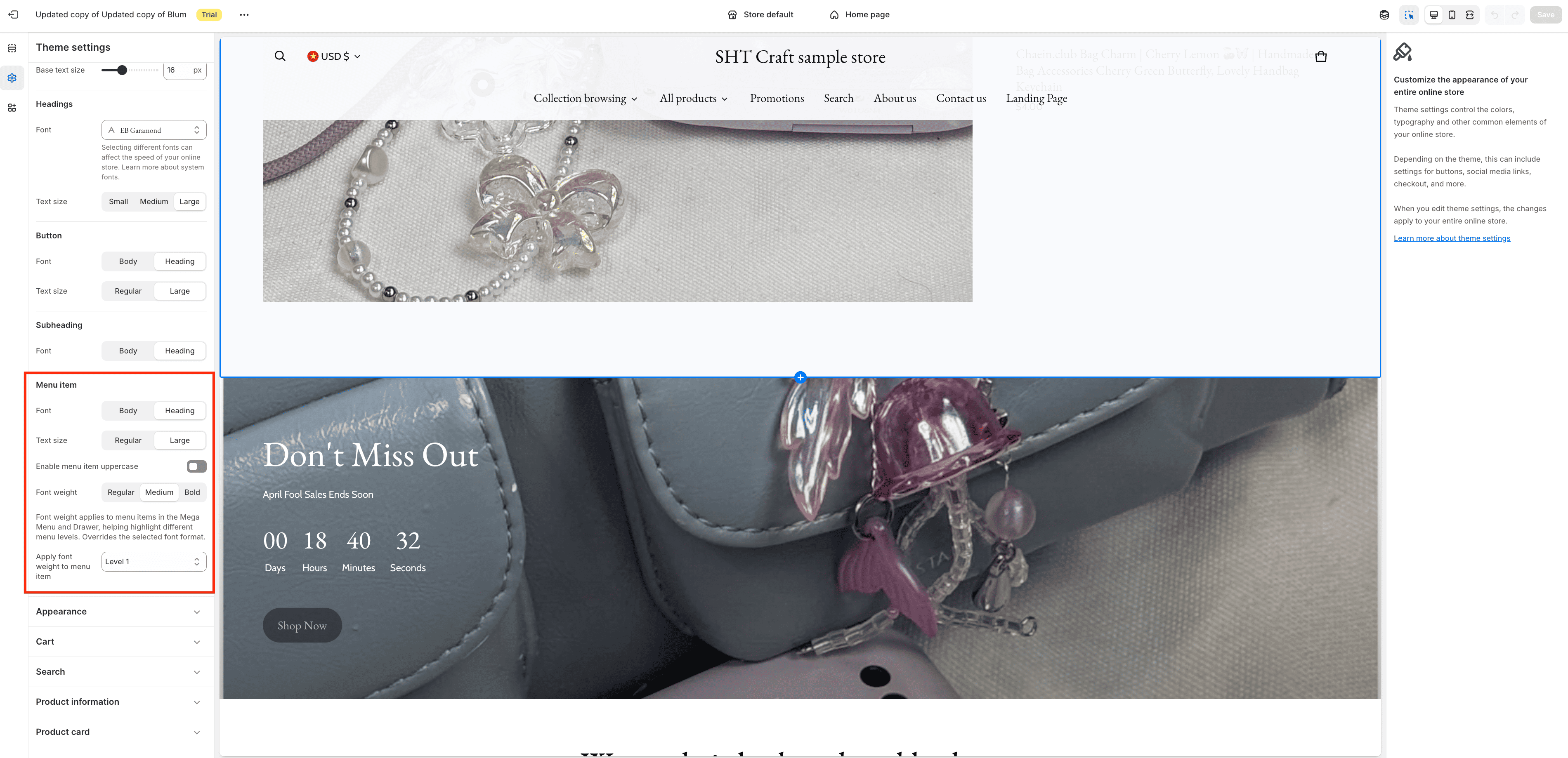 The menu item text font family applies to all menu item text on your store pages. You can choose the same font family as the body text, headings, or a different font family.