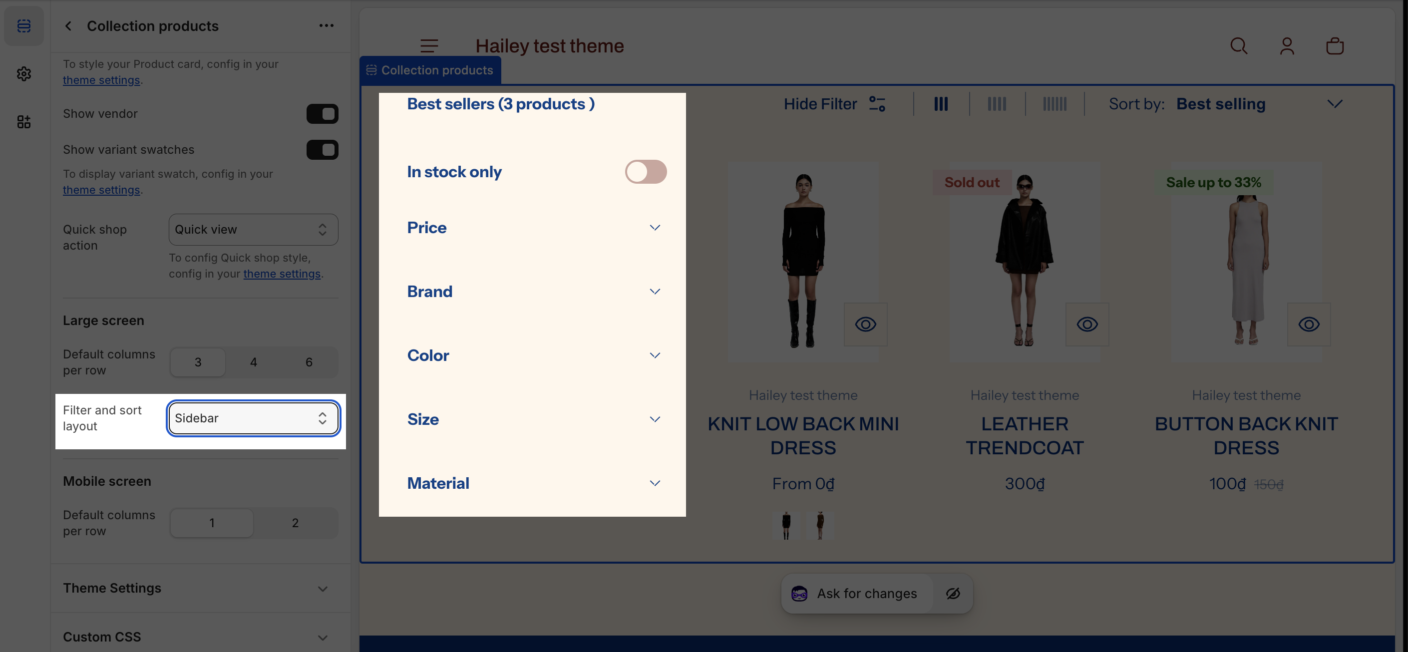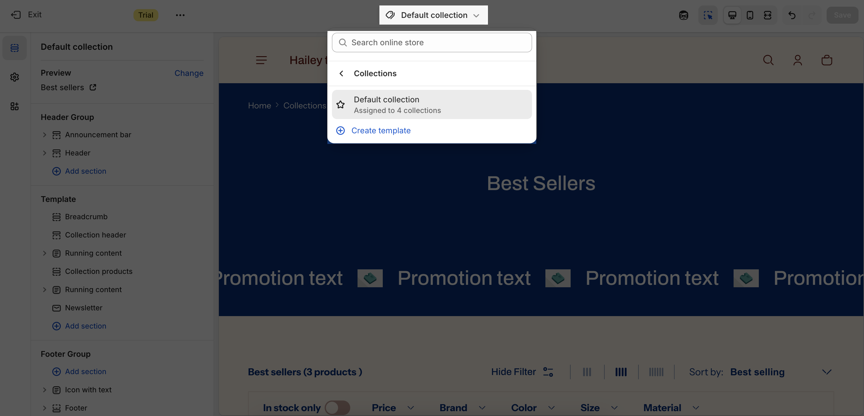 The Collection Products section has several settings that can be adjusted. To change the collection for Preview, on the top left sidebar, click on Change > Select collection.