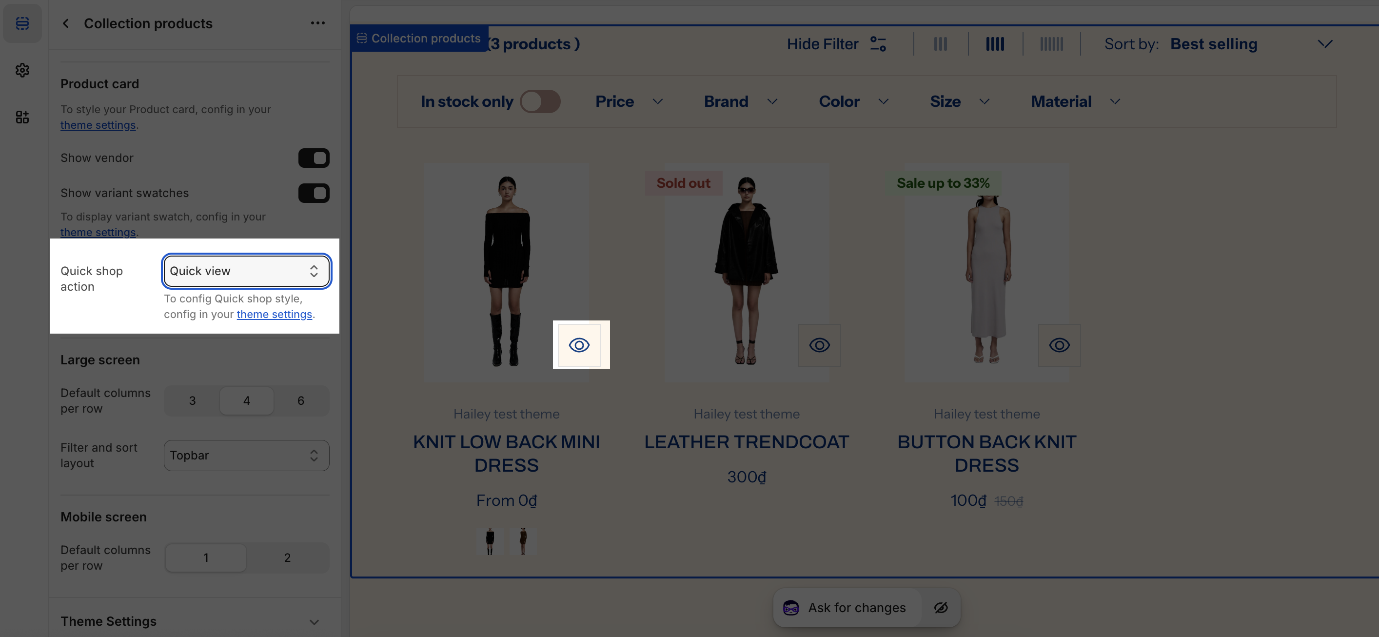 To change the Quick shop action, switch between three styles which are Not use, Quick view, Quick add and Both.