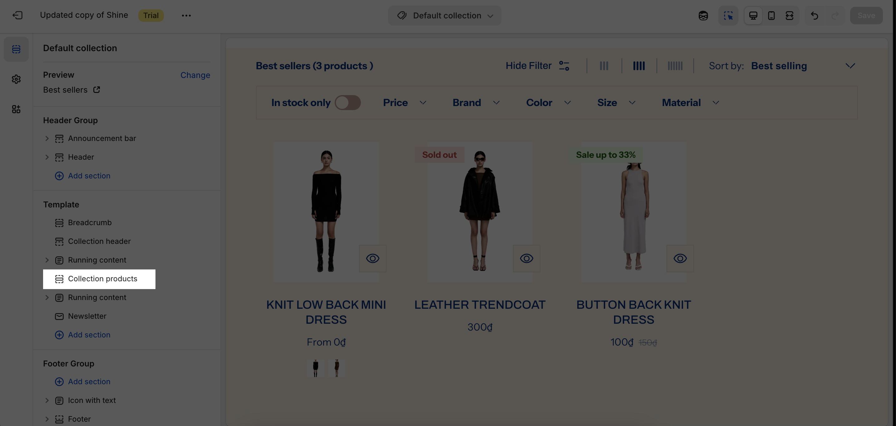 The Shine Theme Collection Products section displays all the products of your selected collection.