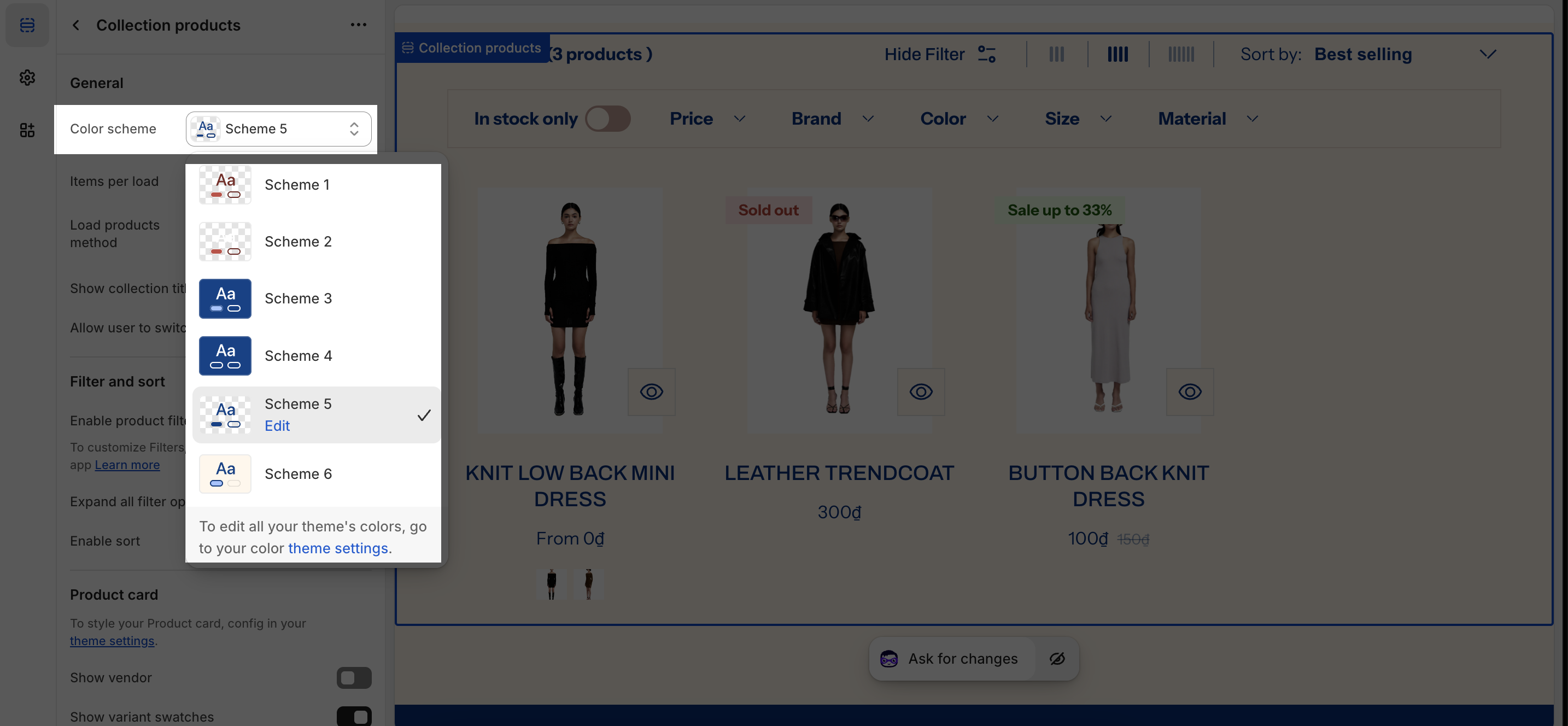 Under the Color Scheme, you can choose a specific scheme for the Collection Products section. To modify or add a new color scheme, go to Theme Settings > Color.