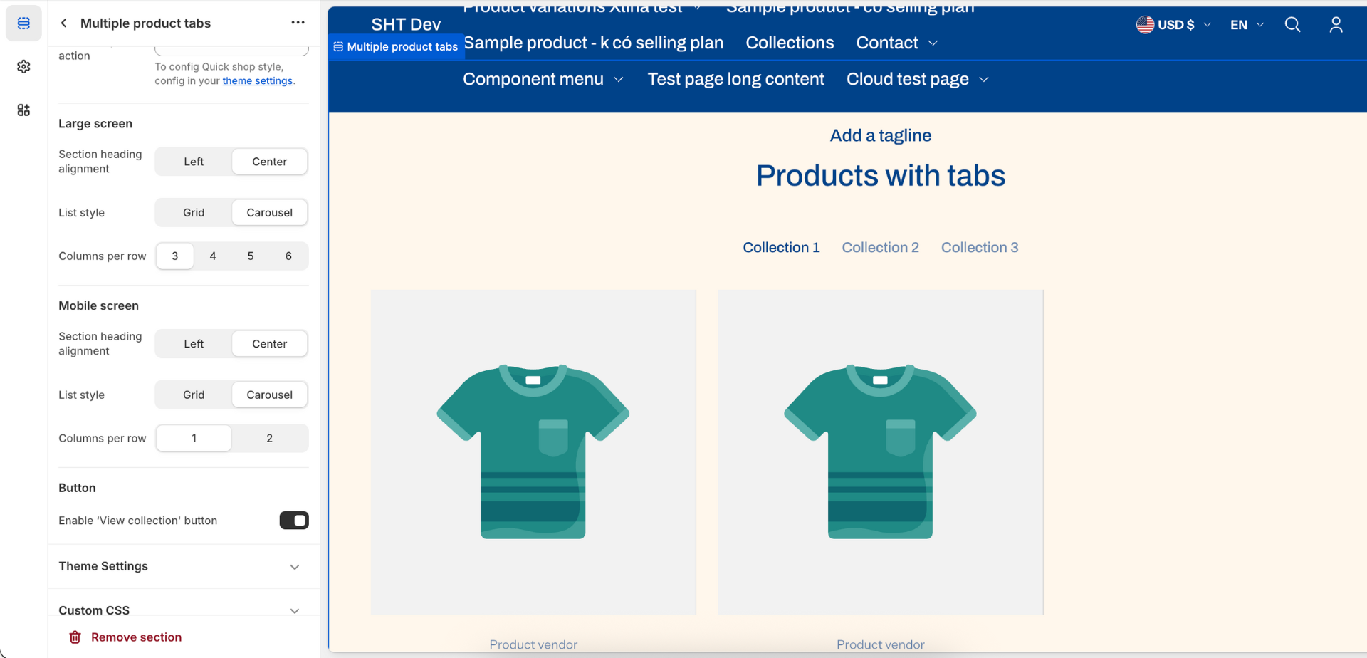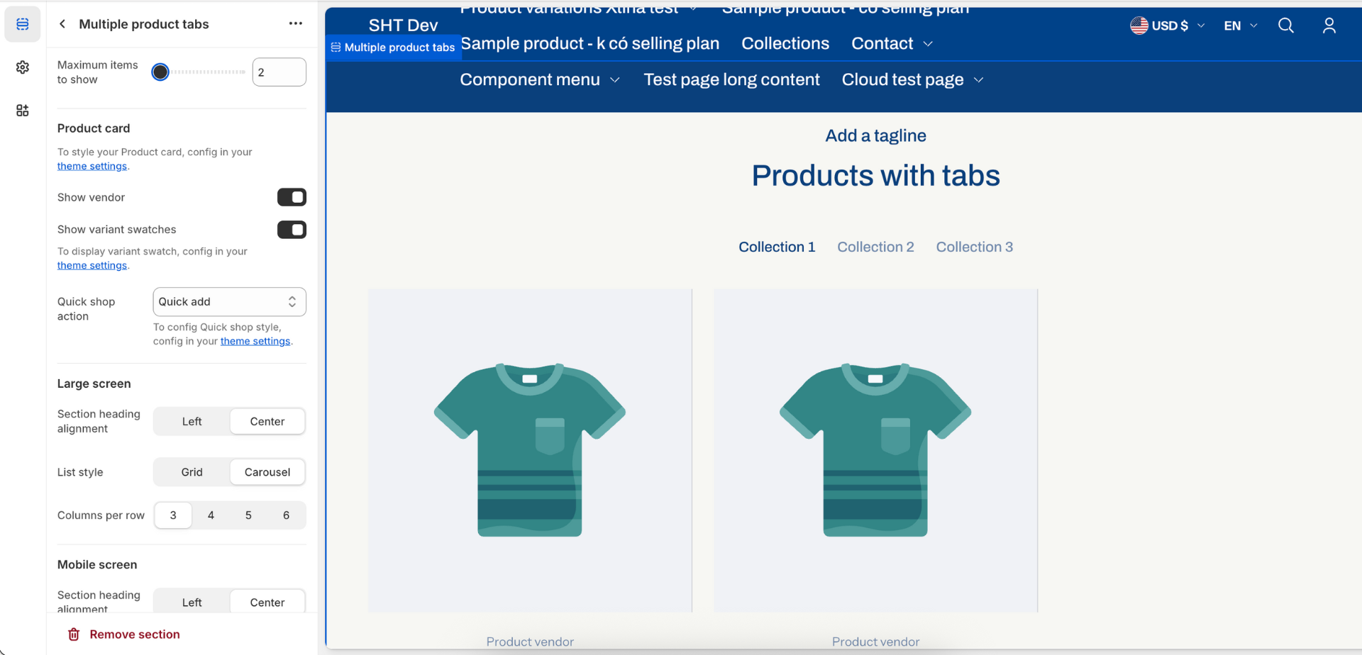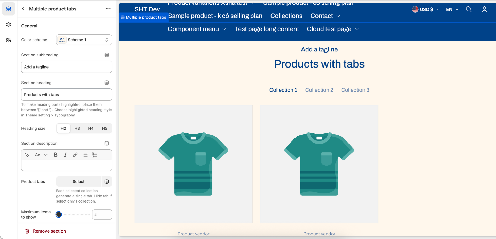 The Shine theme Multiple product tabs section allows you to apply content for the Section subheading, Section heading, and Section description. If you want to hide the message, leave the placeholder empty.