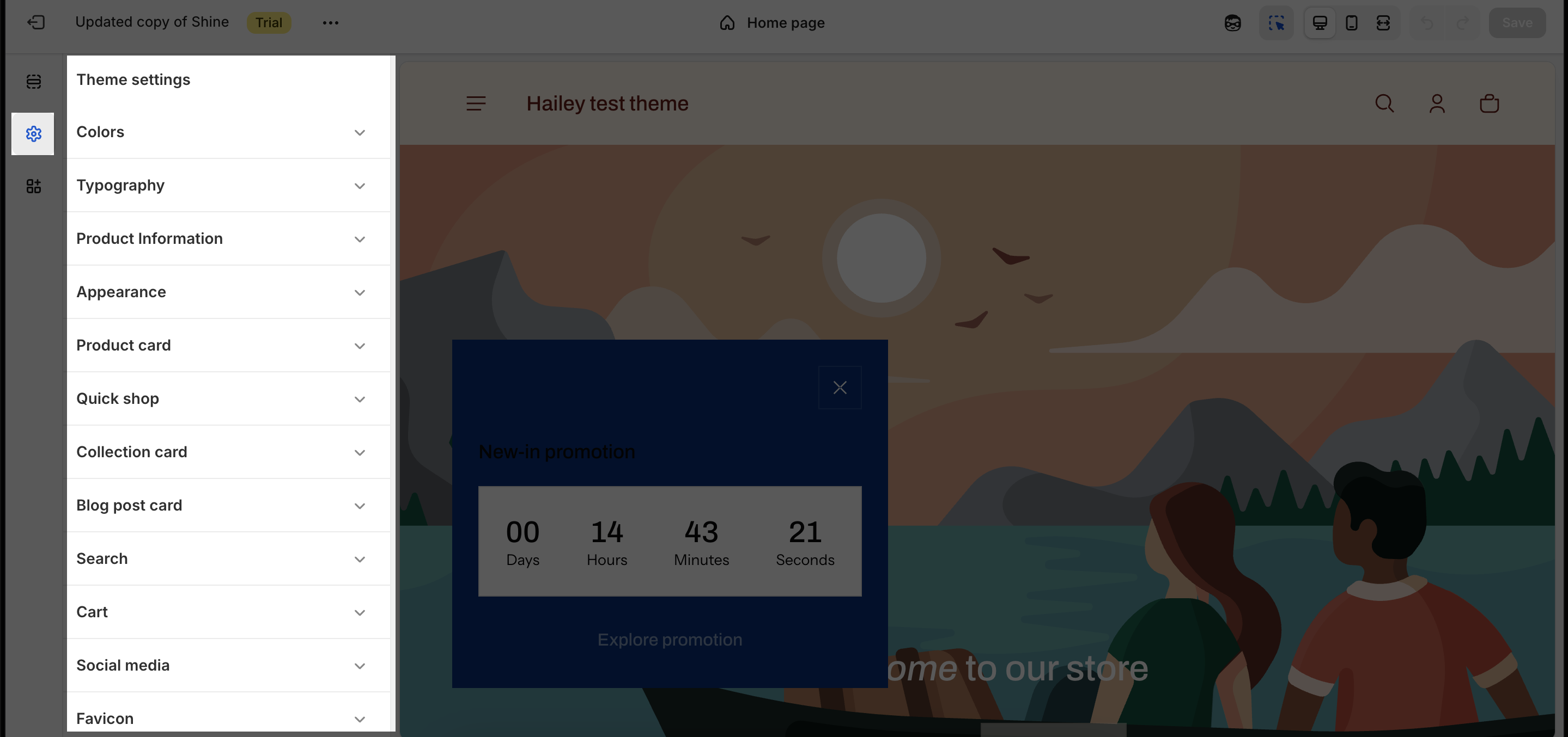 After installing Shine Theme to your Shopify account, you can find the theme settings by clicking on the second icon on the menu bar.