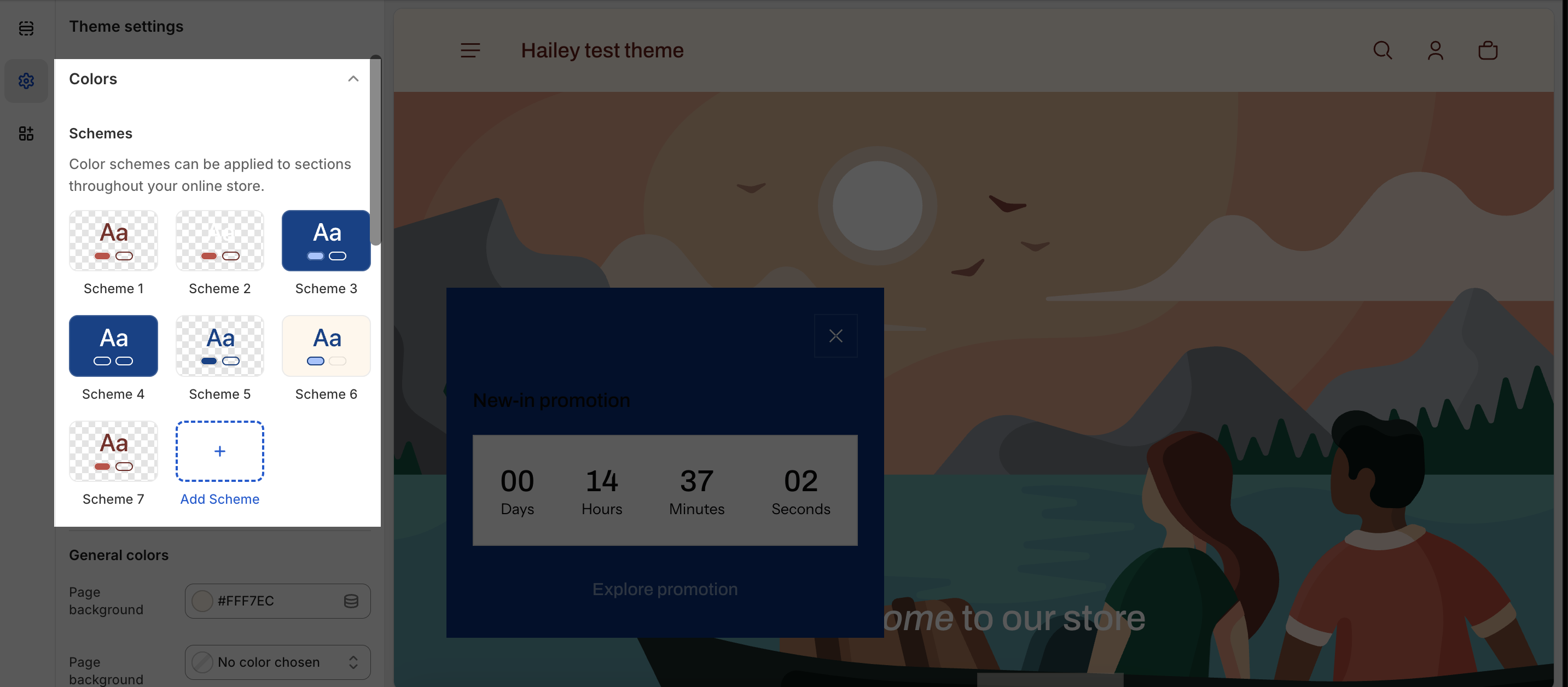A color scheme is a collection of harmonizing colors for your store’s text, background, buttons, and badges. Apply these color schemes to various sections of your store to achieve a cohesive and visually appealing look.
